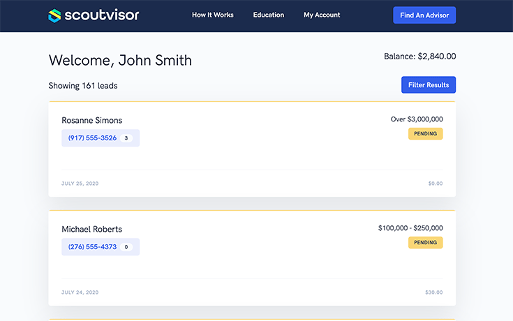Stop wasting time with stale lists of unresponsive & dead phone numbers. ScoutVisor will make sure you're getting the highest quality leads from qualified prospects seeking financial advice.